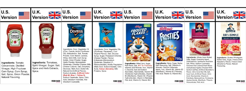 En un mundo donde los alimentos ultraprocesados son cada vez más accesibles, todos sabemos que debemos evitarlos para mantenernos saludables. Sin embargo, es alarmante que acuerdos entre estas corporaciones y los gobiernos determinen que los mismos productos de marca que encontramos en Estados Unidos contengan ingredientes muy distintos y mucho más tóxicos que sus versiones en el Reino Unido y por lo tanto son mucho más perjudiciales para la salud.