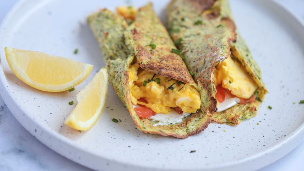 6?? Coloca el salmón ahumado o la proteína que hayas escogido junto a los huevos revueltos sobre la tortilla de calabacín. Espolvorea con cebollino y dobla los lados de la tortilla de calabacín sobre el relleno. Servir inmediatamente.